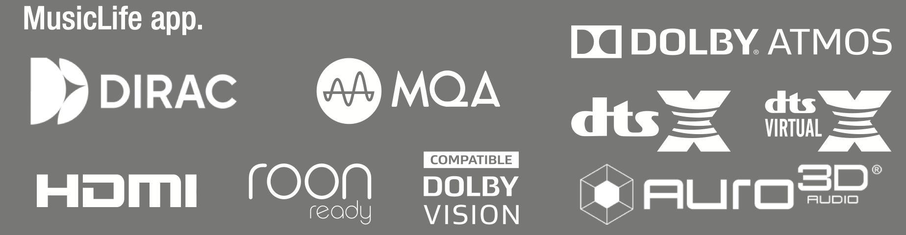 Wydajność i muzykalność można zapewnić dzięki optymalizacji pomieszczenia Dirac Live®, do której można uzyskać natychmiastowy dostęp dzięki zintegrowanemu strumieniowaniu za pomocą Apple® Airplay2, Google Chromecast®, Bluetooth z aptX®HD, Spotify Connect, Tidal Connect i UPnP z aplikacją MusicLife.