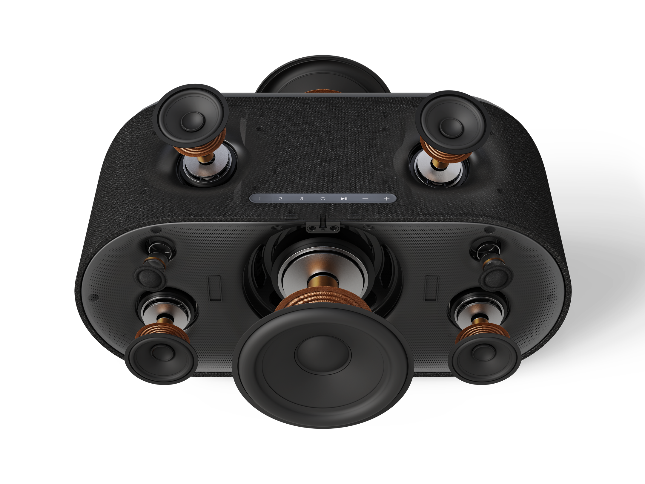 Specjalnie zaprojektowany układ ośmiu przetworników z wbudowanymi subwooferami i głośnikami skierowanymi ku górze zapewnia pełne, szczegółowe brzmienie wypełniające całe pomieszczenie. Każdy przetwornik ma własny wzmacniacz dla maksymalnej kontroli i równowagi.