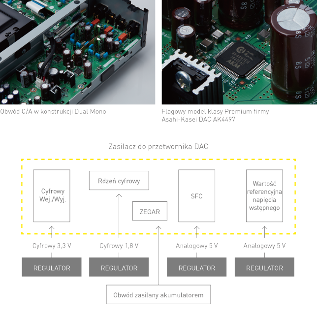 Wysokiej jakości przetwornik C/A klasy Premium i podwójny obwód przetwornika C/A w konstrukcji Dual Mono