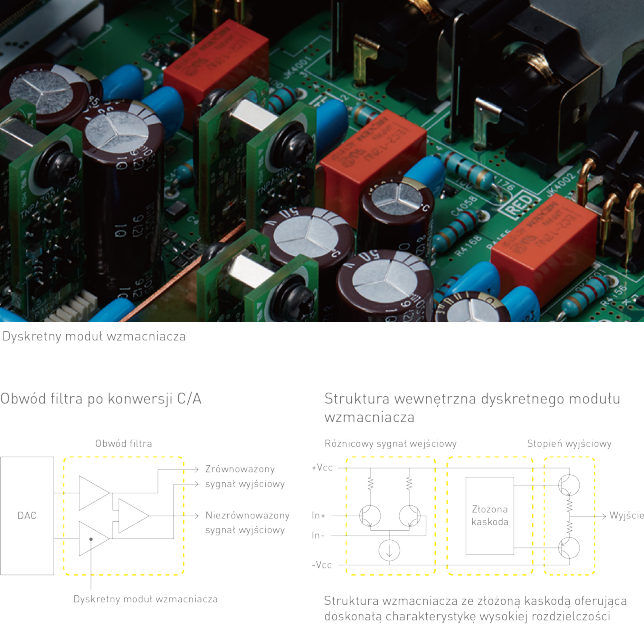W przypadku analogowego sygnału wyjściowego audio obwód zawierający filtry zlokalizowany po konwersji C/A decyduje o jakości dźwięku. Obwód zawierający filtry w modelu SL-G700 nie obejmuje układu scalonego wzmacniacza operacyjnego, ale moduł wzmacniacza oparty na oryginalnej dyskretnej konstrukcji. Wykorzystanie tranzystorów niskoszumowych i rezystorów cienkowarstwowych redukuje szum generowany w obwodach. Dostrajanie precyzyjne, np. w zakresie zwiększenia natężenia prądu roboczego, poprawiło odpowiedź, stosunek sygnału do szumu i współczynnik zniekształceń. W wyniku tego model SL-G700 zapewnia w dużym stopniu liniowe i wierne odtwarzanie dźwięku, a równocześnie nie dochodzi do przeoczenia nawet najdrobniejszych niuansów uchwyconych w źródle.