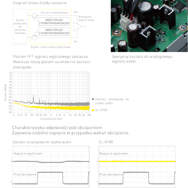 Jakość zasilania jest niezwykle istotna, jeśli celem jest odtwarzanie dźwięku z zachowaniem dużej wierności. Zakłócenia zasilania i jego stabilność mają bezpośredni wpływ na jakość dźwięku odtwarzanego z sygnałów audio, w szczególności dla analogowego sygnału wyjściowego audio. Model SL-G700 jest wyposażony w specjalny zasilacz do analogowego sygnału wyjściowego audio. Jego zasilacz przełączalny bez sprzężenia zwrotnego redukuje wahania częstotliwości przełączania. W połączeniu z oryginalnym, ustabilizowanym obwodem zasilacza ten specjalny zasilacz dostarcza stabilną moc przy niskim szumie. W strukturze obwodu dyskretnego nie wykorzystuje się żadnych uniwersalnych układów scalonych i drobiazgowe dostrajanie zapewnia moc zoptymalizowaną na potrzeby obwodów analogowych, tym samym gwarantując wysoki stosunek sygnału do szumu i znakomitą jakość odtwarzania, co stanowi wizytówkę dźwięku uzyskiwanego dzięki urządzeniom firmy Technics.