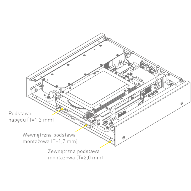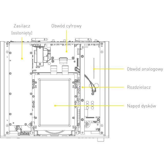 Podstawa montażowa o dużej sztywności oraz aluminiowy wykonany z odlewu ciśnieniowego napęd dysku — mechanizm SACD o dużej stabilności