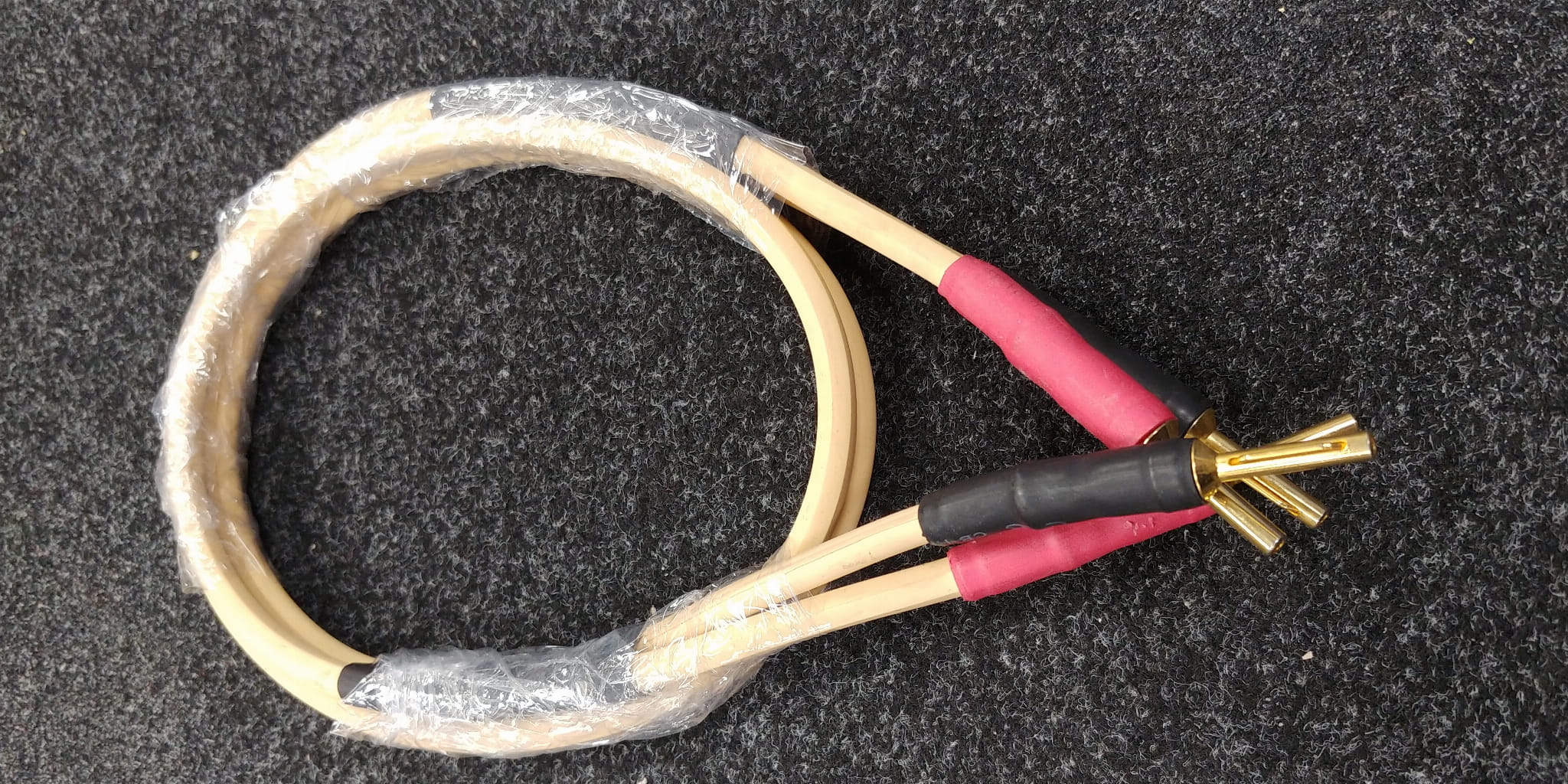 Krótki przewód głośnikowy oparty na przewodzie Van Den Hul CSS-122 i wtykach angielskiej marki QED.